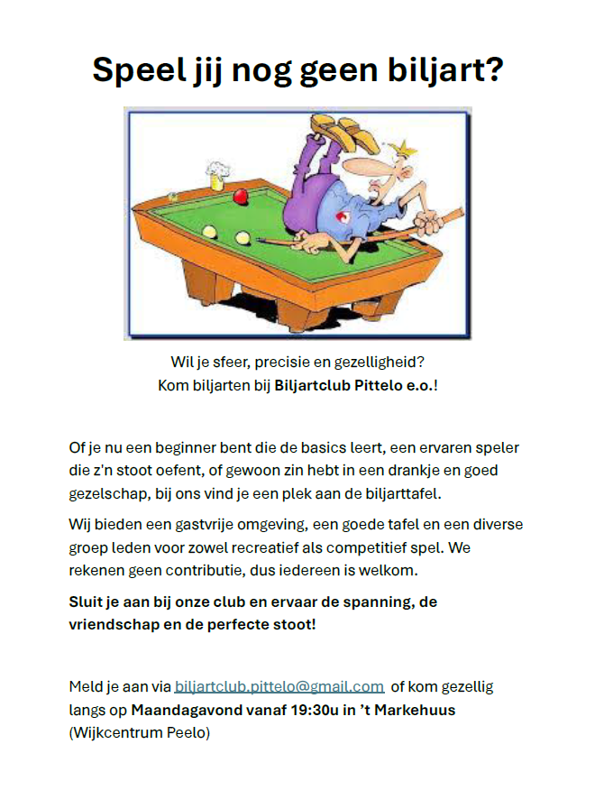 Interesse? Kom gewoon langs of stuur ons een berichtje via biljartclub.pittelo@gmail.com